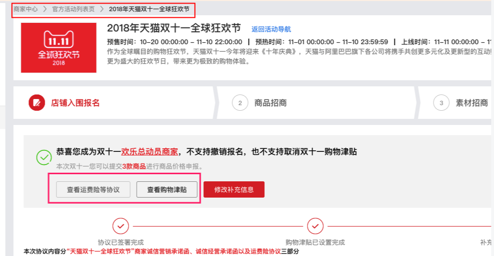 特殊情形商家可通过“商家中心”-“官方活动列表页”-“2018年天猫双十一全球狂欢节”-“查看运费险等协议”-““天猫双十一全球狂欢节”商家诚信营销承诺函”路径查看,如图: