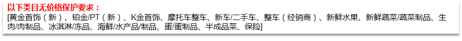 A:亲,2018天猫双十一中,[黄金首饰(新)、铂金/PT(新)、K金首饰、摩托车整车、新车/二手车、整车(经销商)、新鲜水果、新鲜蔬菜/蔬菜制品、生肉/肉制品、冰淇淋/冻品、海鲜/水产品/制品、蛋/蛋制品、半成品菜、保险]类目不做价格保护要求。
