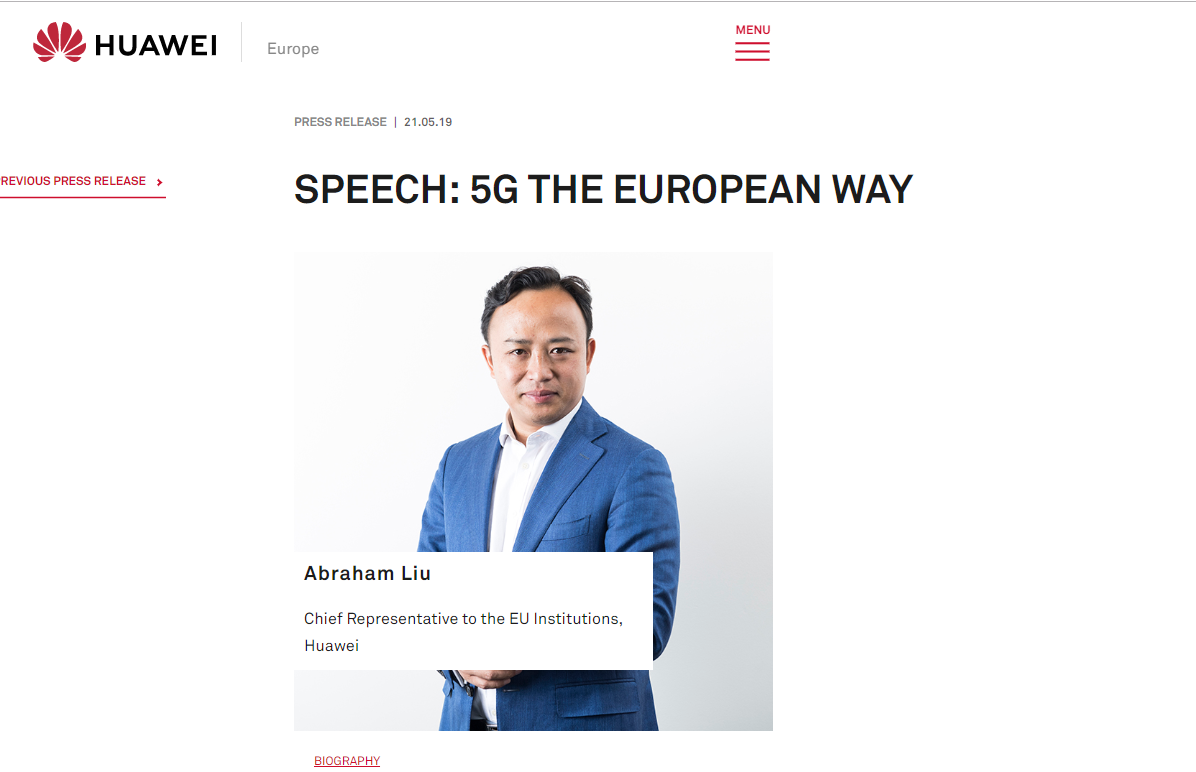 欧洲当地时间5月21日,华为驻欧盟机构首席代表刘康在欧盟总部布鲁塞尔发表了一次演讲,主题为“5G The European Way”(5G的欧洲之路)。