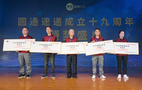 近日,5名快递小哥分别从圆通速递董事长喻渭蛟手中,接过了市值约10万元的股票奖励。