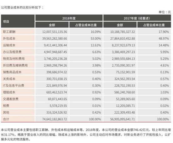 顺丰这几年遭遇了净利润的下滑,为了缓解用人压力,近几年顺丰选择的是大力发展“外包”,顺丰2018年报显示,顺丰拥有各种用工模式收派员约29.14万人,其中自有员工4.5万人,劳务派遣200人,其他用工在24.62万人左右。外包成本达395.6亿,占营业成本比重的53%,是其第一大成本来源。