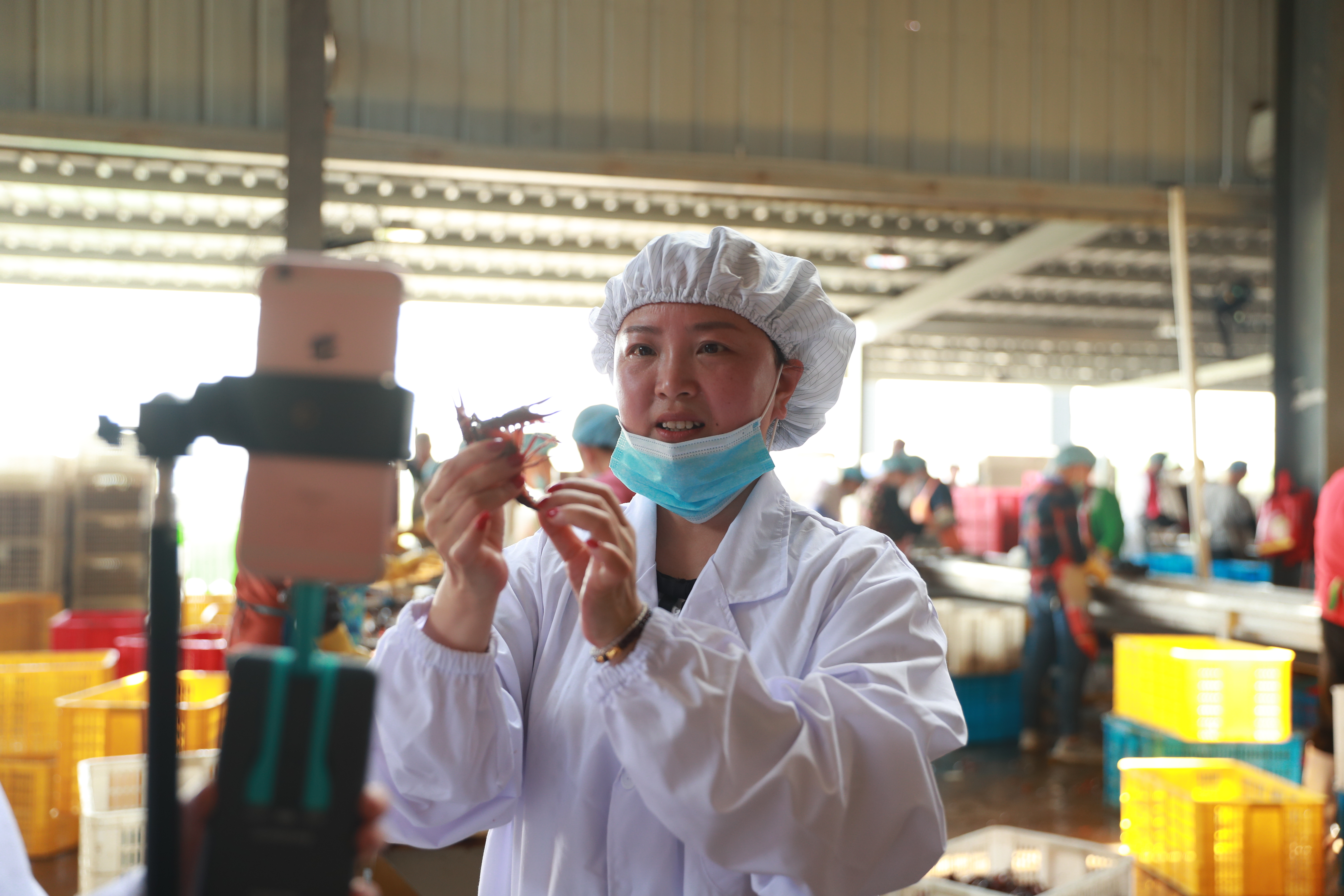 16日,湖北农民主播在小龙虾加工厂探访直播,当天3个小时的直播助销120万只小龙虾。