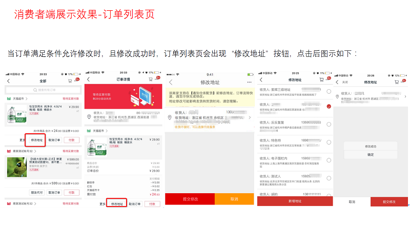 在订单提交后,未付款之前,买家地址拍错,会联系商家修改或者自己重拍或者部分买家放弃购买,为了降低商家修改地址人力成本,及减少部分买家放弃购买,在未付款订单列表和订单详情,平台开放买家自助修改地址功能(无需商家报名,淘宝和天猫商家平台统一开放)。