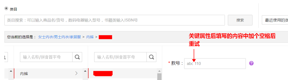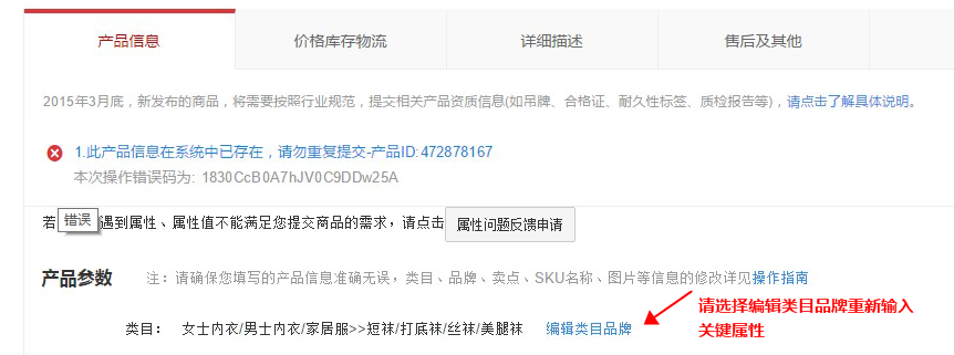 温馨提示:若您的商品是非达尔文商品,请点击“编辑类目品牌”,对产品关键属性(例如:款号)中填写的内容信息中加个空格后点击发布商品