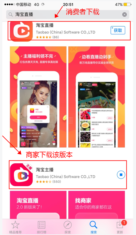 注意:若天猫商家满足以上2个条件,可自主申请开通淘宝直播发布权限,开通方法请使用手机下载【淘宝主播app】进行入驻(ps:不要使用电脑端入驻,淘宝直播app为消费者版本)