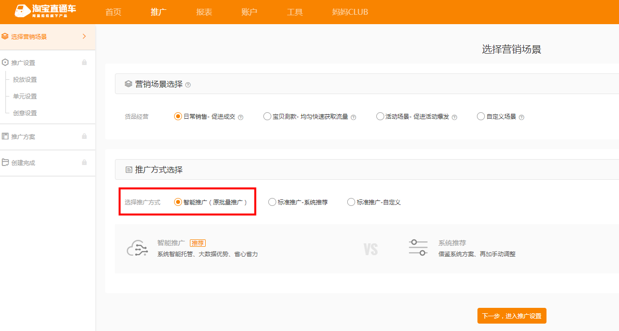 您在创建直通车计划的时候,请认准推广方式为“智能推广(原批量推广)”即可。