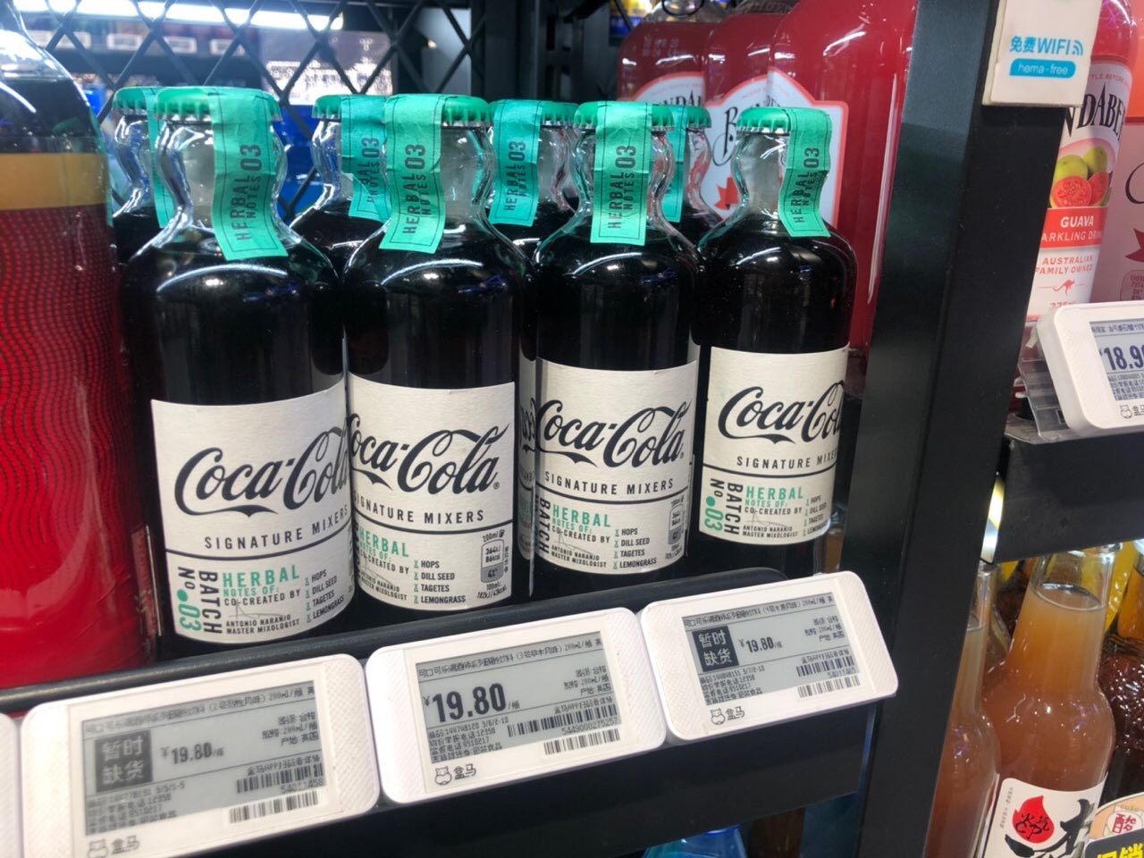 今年6月,可口可乐在英国发布了4款搭配调酒的可乐,复刻了1894年的第一代可口可乐瓶身和“木调、烟熏”等口味,复古的造型和奇特的口味受到走在潮流前端年轻人的喜爱。盒马买手早已关注了这款产品,在全国率先引进。