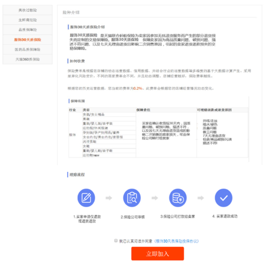 2. 也可以直接访问服饰30天质保险的加入页面:https://www.taobao.com/markets/baoxian/tmall/detail#FSZBX。