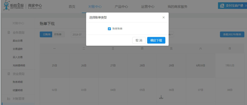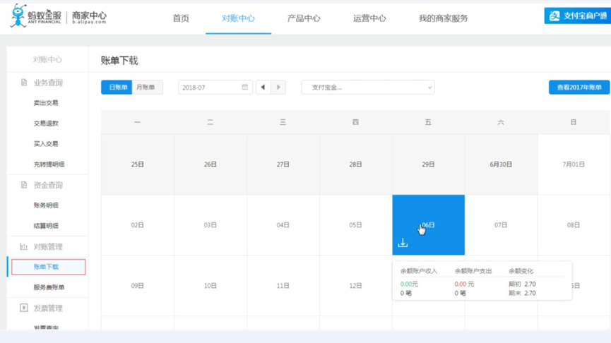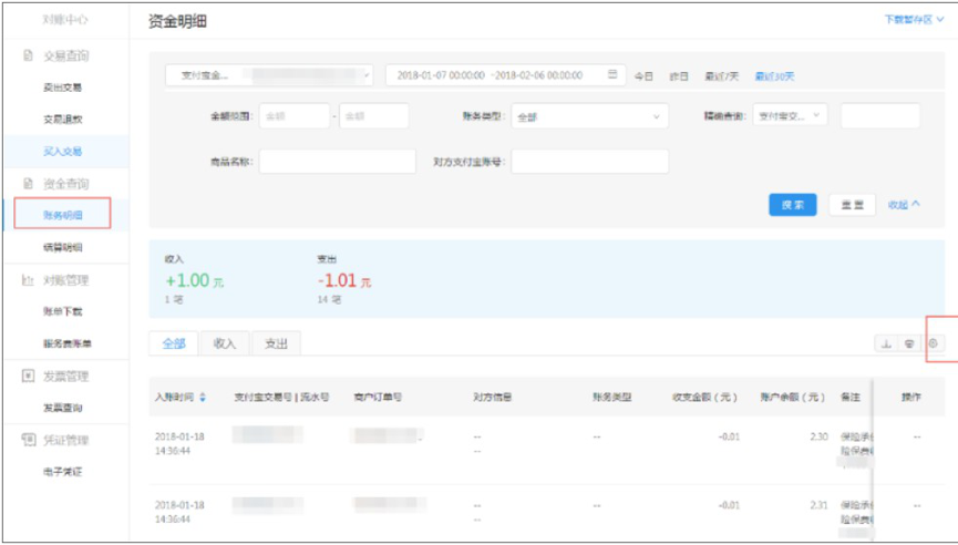 登录企业版支付宝账户-对账中心-资金查询-财务明细,点击右边红框所示图标,在备注一栏输入险种名称【服饰30天质保险】,即可查询保费支出和理赔收入明细