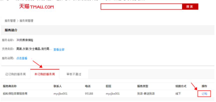 3. 点击以上入页面的【立即加入】后,系统会跳转到天猫服务平台的【服饰30天质保险】订购页面。在【未订购的服务商】tab页面下,选择订购服饰30天质保险即可。订购后,保险公司会对商家的订购申请进行审核,审核通过后服饰30天质保险服务立即生效。