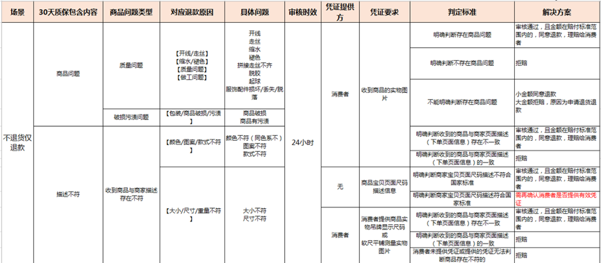 消费者举证要求 | 1、 提供肉眼清晰可见的所属订单商品问题的图片 2、 在退款理由中准确描述相关商品问题 |