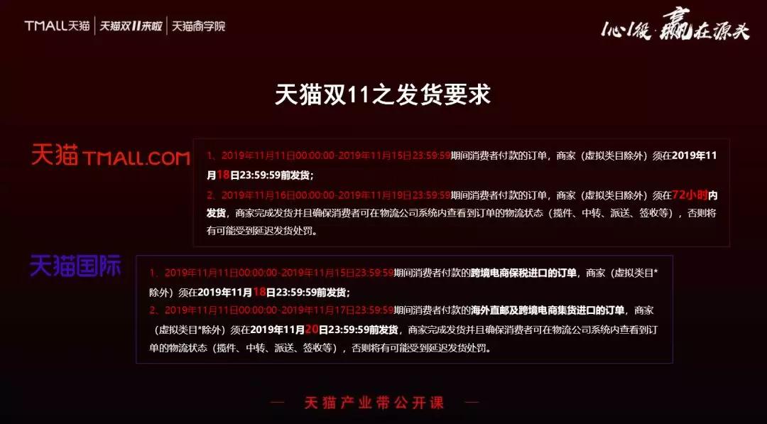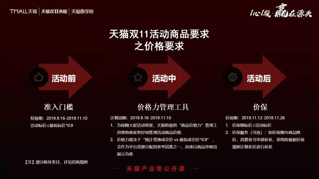 2.天猫双11的招商要求中强调双11的价格要求和发货要求。其中价格要求分活动前准入门槛的内容,活动中商品价格力管理工具,活动后价保服务。并为商家区分了天猫订单和天猫国际订单的发货要求。