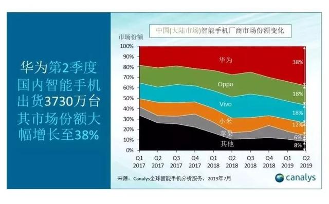 IDC数据显示,苹果2018年在中国大陆市场占据9.1%的市场份额,比2017年同期缩水11.7%。到2019年第二季度,苹果市场份额已下滑至5.8%,而市场份额第一的华为销量占比高达38.2%,是苹果的六倍之多。