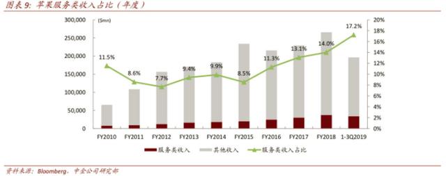 据苹果发布的2019年第三季度财报,iPhone业务营收7年来对总营收贡献首次不足50%,这是因为苹果服务营收接连刷新纪录。第三季度,苹果各项服务收入达到114亿美元,占总收入的21.3%,高于去年同期的19.1%。库克认为,苹果在从依靠单一产品走向多样化方面已经取得了初步成功。