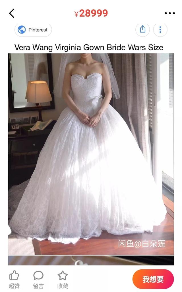 而在中国,二手电商平台上出售的婚纱,也不在少数。以咸鱼为例,在该平台上搜“婚纱”,可以找到售价从十几元到几万元不等的二手婚纱,甚至还能搜到Vera Wang、Hayley Paige等大牌。