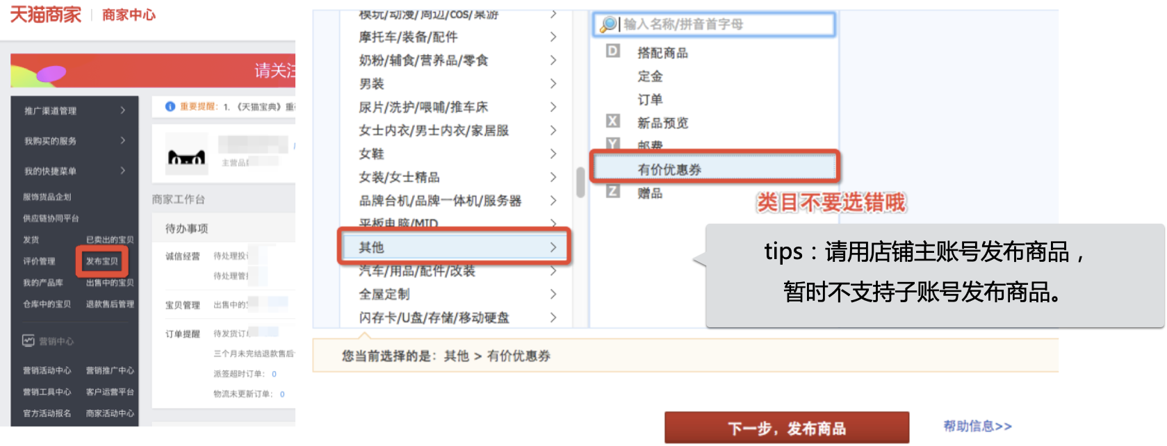 第一步:在商家中心点击发布宝贝(不是发布新商品),选择其他-有价优惠券类目。点击下一步,发布商品。