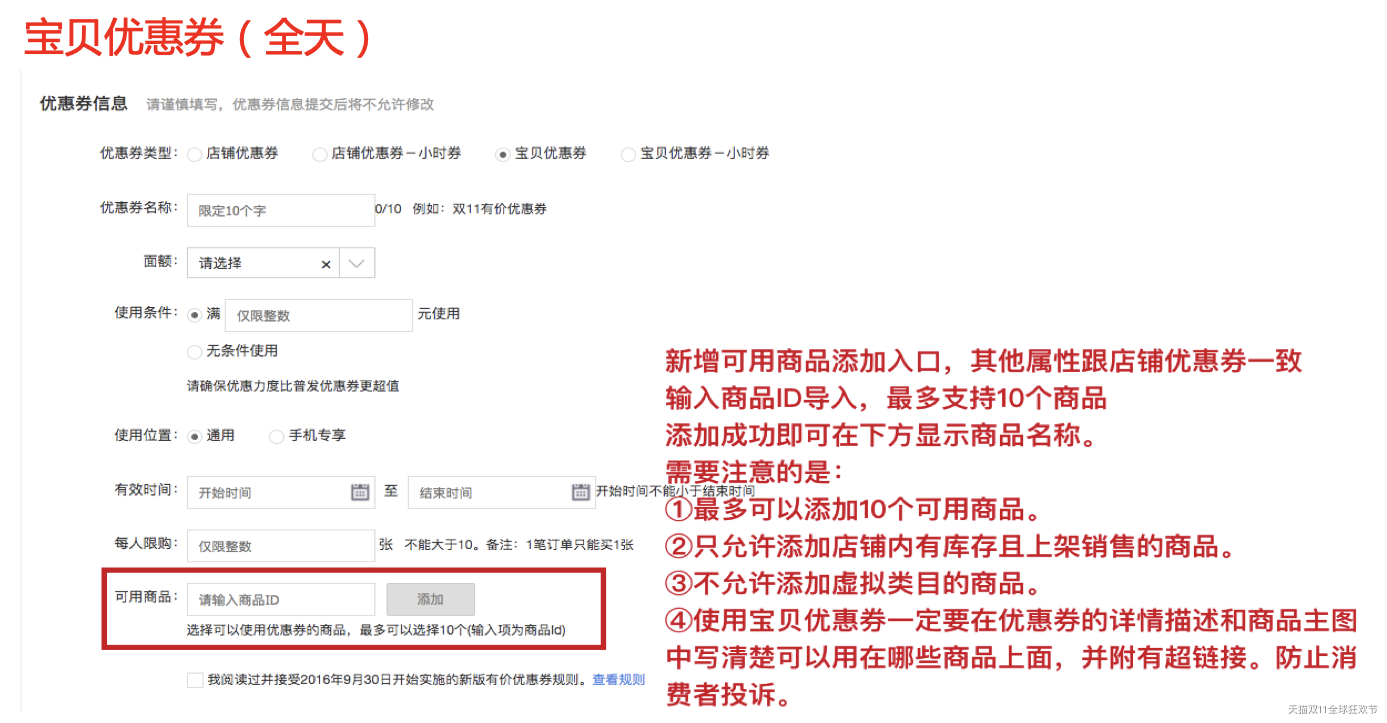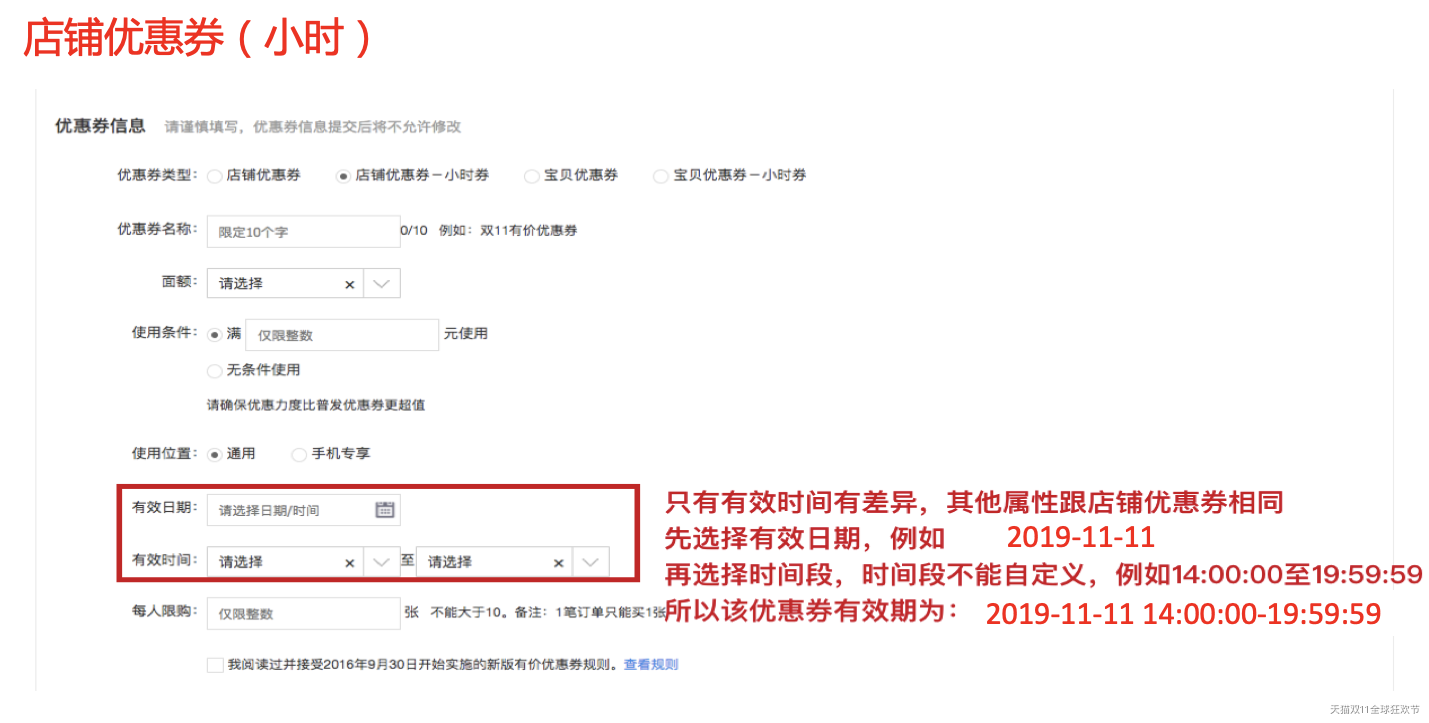 | 10.15 00:00-11.07 23:59 | 新建有价优惠券 | 只能新建双11当天使用的有价优惠券 |