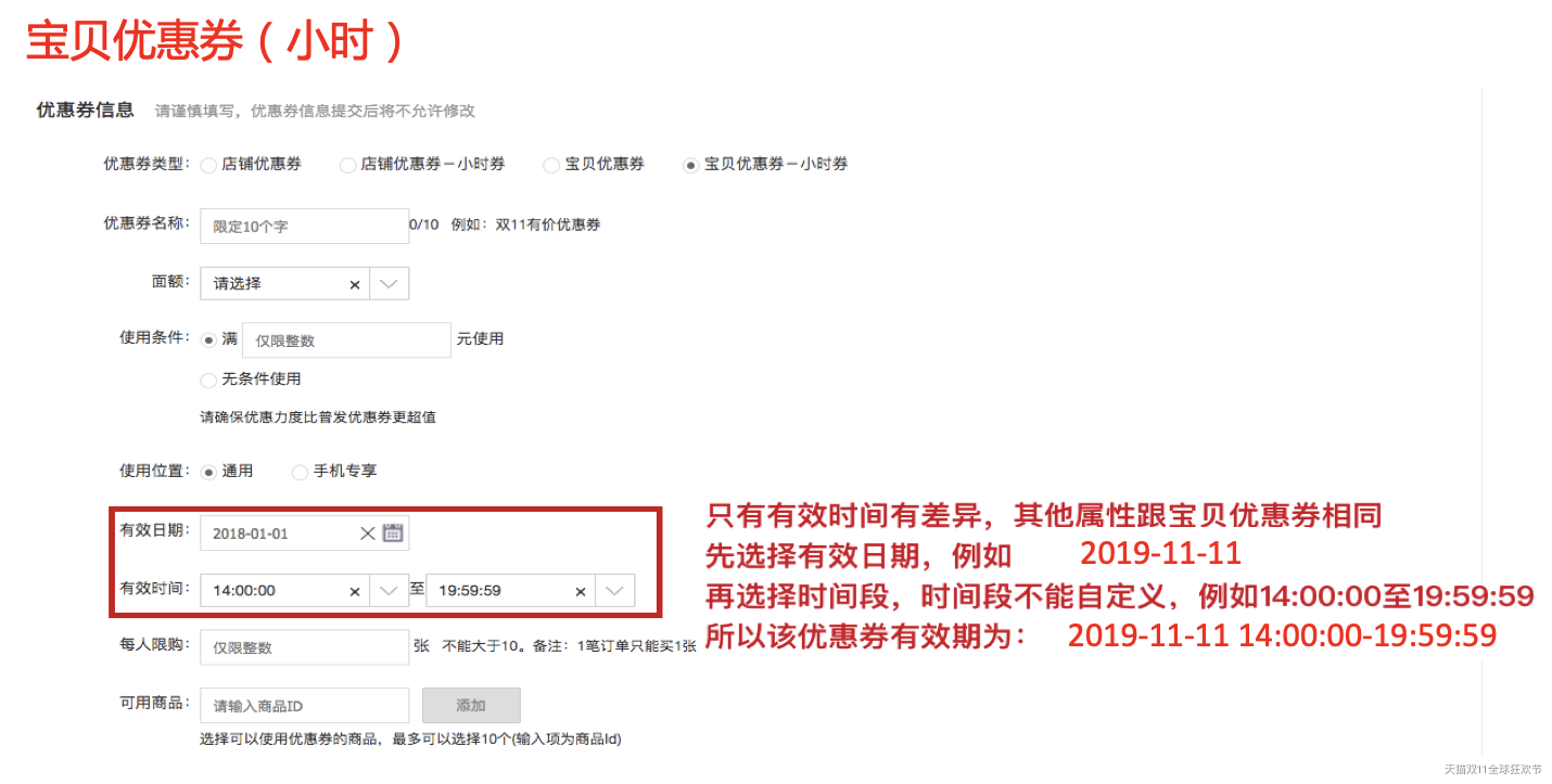宝贝优惠券-小时券 | 某天的固定小时段 | 计入最低价,店铺部分宝贝,最多绑定10个商品 |