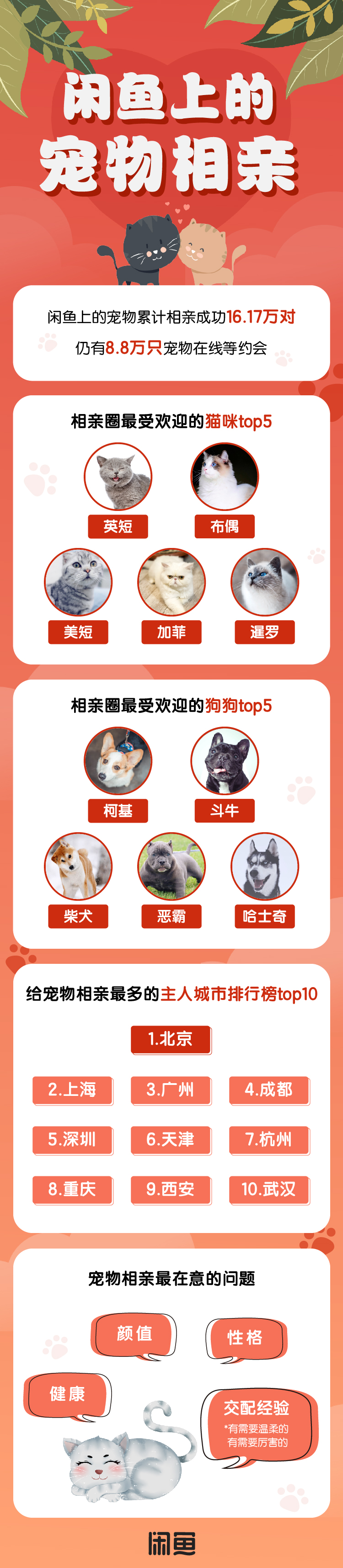 此外,北京、上海、广州、成都、深圳的铲屎官最爱给主子网络相亲,仿佛化身人民广场上的爸妈到处发传单,健康、颜值、性格、交配经验是他们在相亲帖中提及最多、最关心的问题。