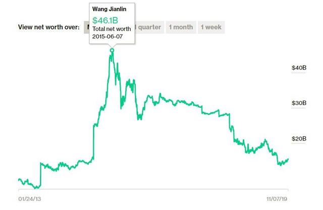 根据彭博亿万富豪实时指数的轨迹,王健林的财富在2015年6月达到巅峰。这一年,万达院线登录深交所,之前万达商业地产、AMC院线相继登录港交所和纽交所,王健林执掌三家上市公司,随着股价的波动,他也来到了人生的至高处。
