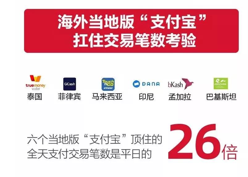 今年全球有超过220个国家和地区,集体进入双11时间。官方数据显示:用支付宝技术支持的速卖通、Lazada、Daraz、天猫海外等海外电商平台上,支付笔数同比增长了3倍,线上支付用户量同比增长 5倍。其中,有6个当地版“支付宝”参加了Lazada或Daraz上的双11,它们扛住了年度交易巅峰大考,平均的全天支付交易笔数是平日的26倍。