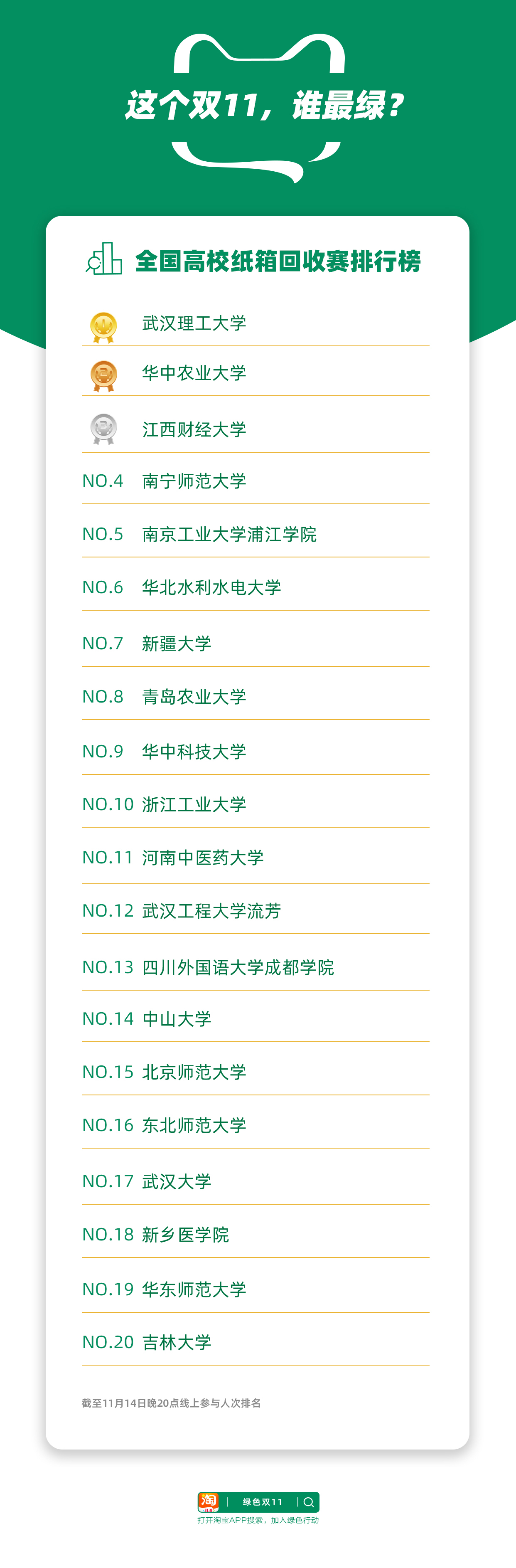 数据显示:华中农业大学、江西财经大学、南宁师范大学、南京工业大学浦江学院、华北水利水电大学、新疆大学、青岛农业大学、华中科技大学、浙江工业大学等高校学生跻身绿色双11“回箱计划”参与人数前十。
