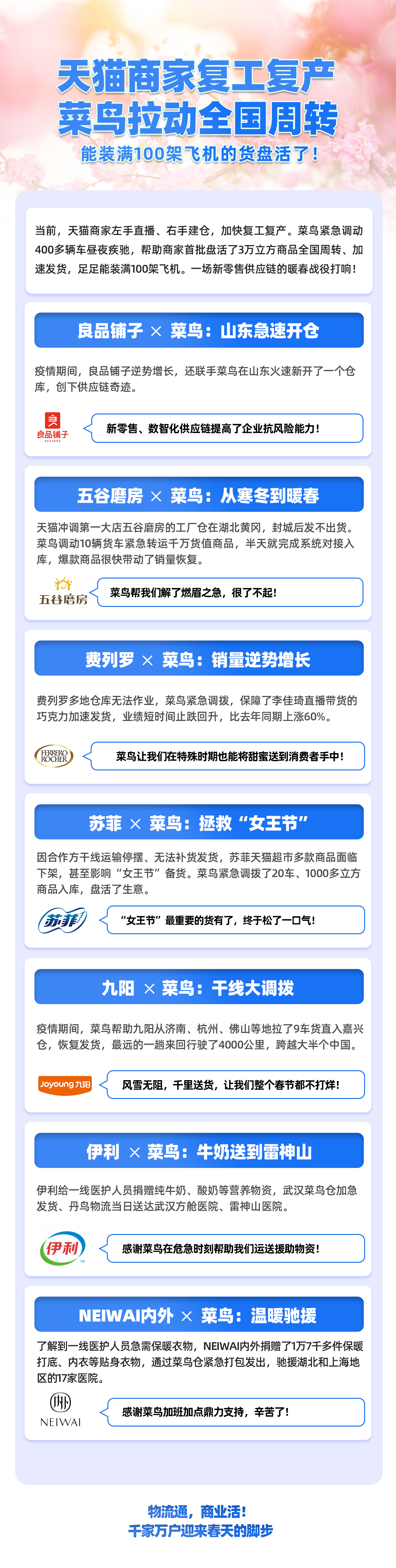 2月以来,天猫菜鸟接到很多商家求助。在不到20天时间里,菜鸟紧急调动400多辆货车,首批拉动超过3万立方商品大周转。这些商品足足能装满100架飞机,助力天猫50多个商家盘活了生意。