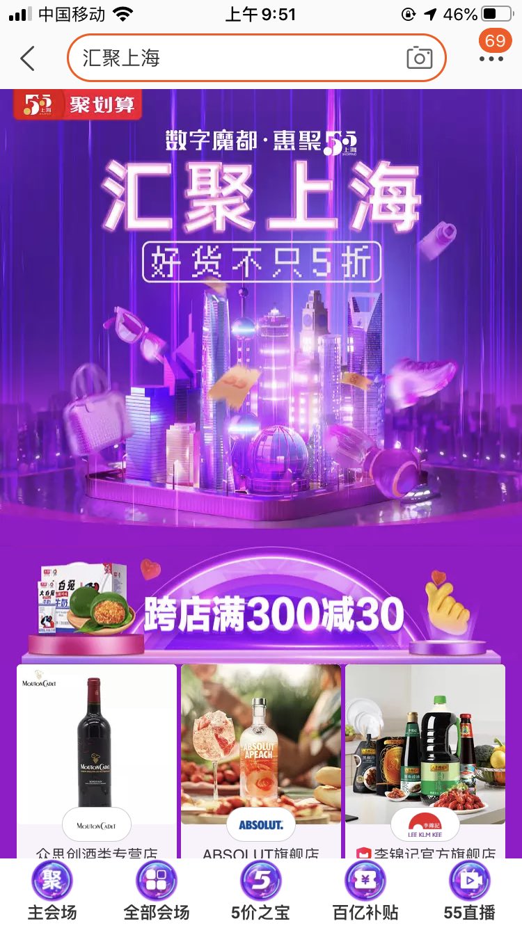 消费者打开手机淘宝,搜索“汇聚上海”,就可直达聚划算为“五五购物节”专设的活动页面。5月5日零点起,跨店满300减30,大批大牌商品五折开抢,聚划算百亿补贴还将针对上海商品推出“魔都大礼包”。