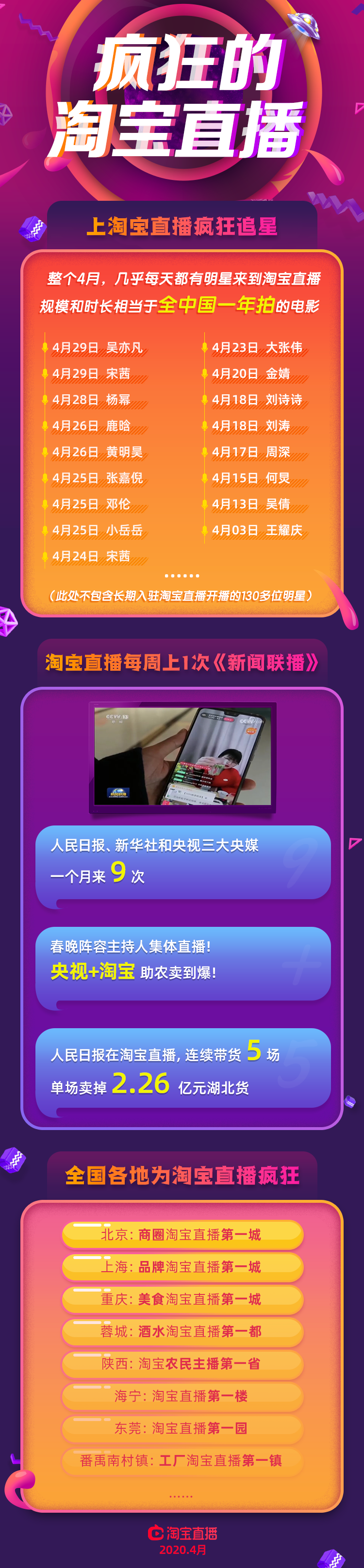 淘宝直播还带动全社会掀起助力经济的带货潮。不完全统计,整个4月,淘宝直播间里每晚都有明星在帮各地带货。知名综艺节目《向往的生活》《极限挑战》等,都在节目录制中,特别在淘宝直播间里开起了公益直播,各地农产品纷纷秒光。