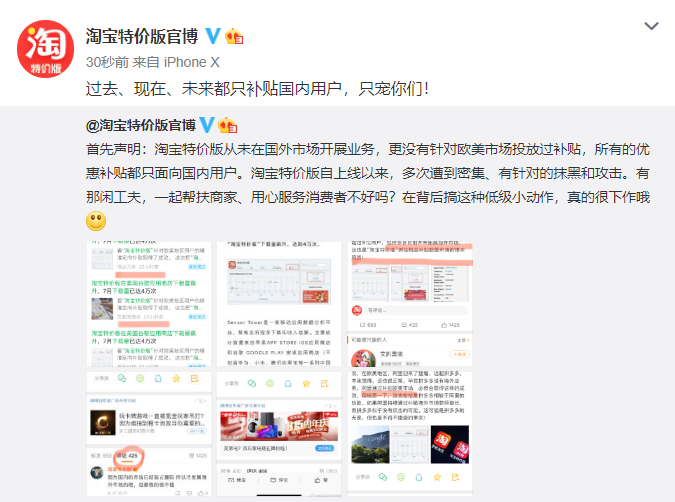淘宝特价版进一步表示,过去、现在、未来,都只补贴国内用户。