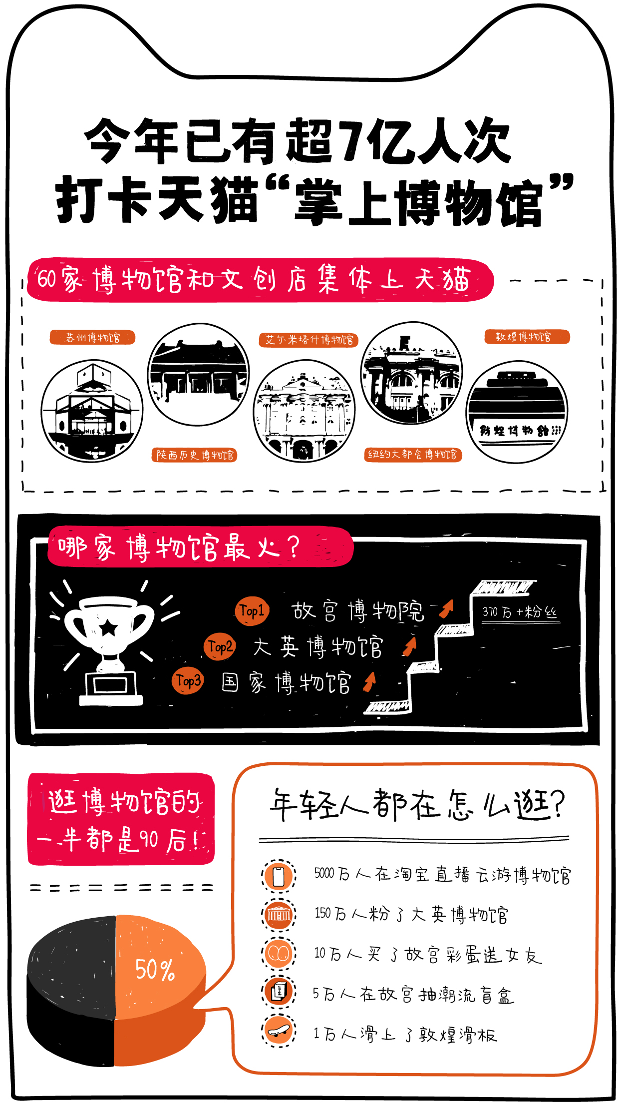 今年疫情之下,敦煌、三星堆等博物馆集体上天猫,云游“掌上博物馆”成为潮流。“天猫新文创2.0计划”发布一年来,截至目前已有海内外60多家博物馆和文创店入驻天猫,今年吸引了超过7亿人次在线打卡,故宫博物馆、大英博物馆、中国国家博物馆最火。