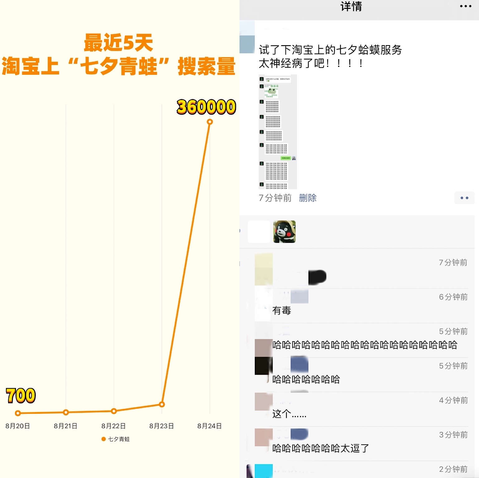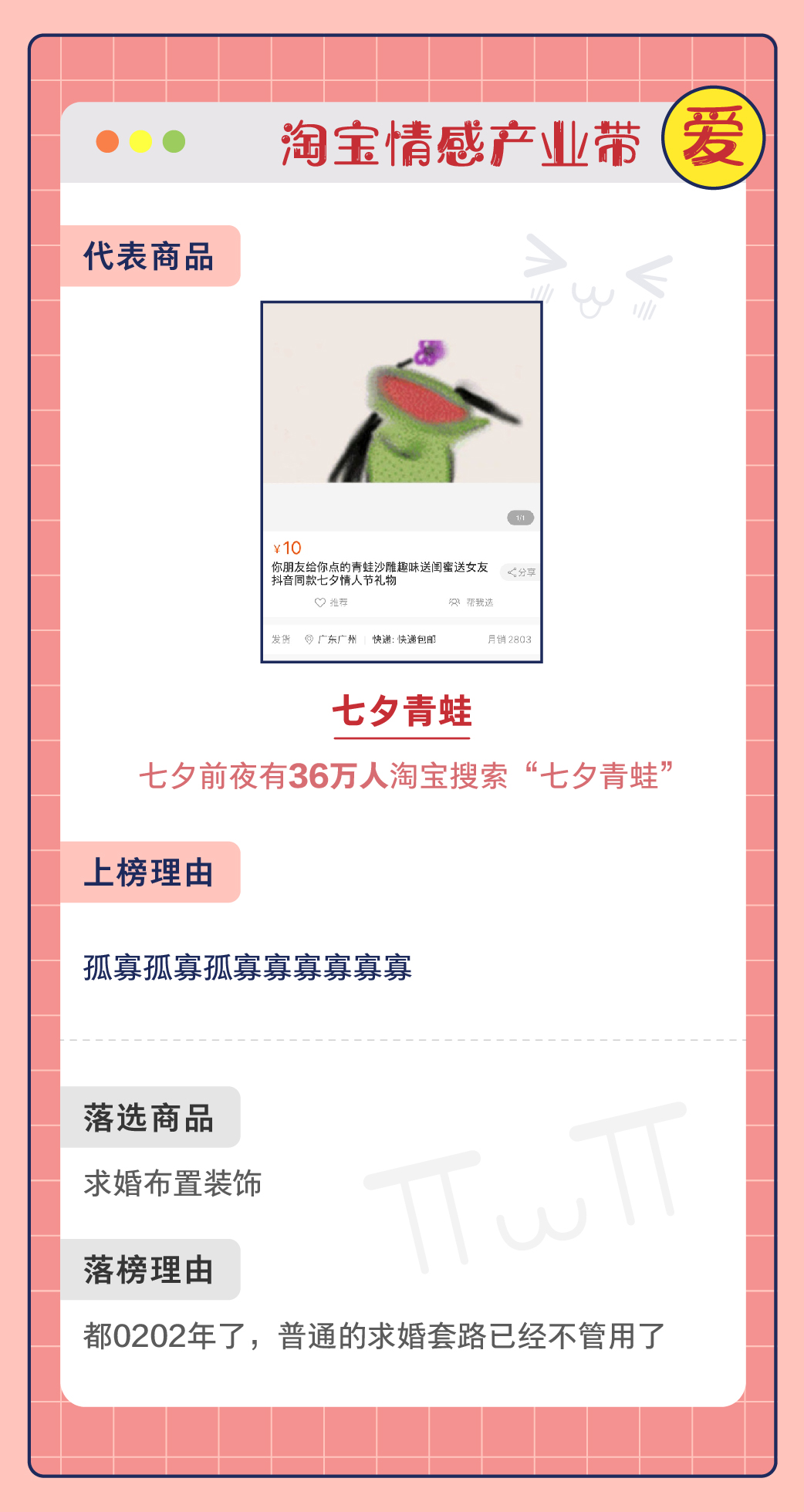不仅如此,七夕前大量年轻人来淘宝寻找爱情解决方案,却无意中带火了一只“七夕青蛙”。在淘宝给朋友点一只“青蛙”后,会有专人去加他好友,然后一直在聊天中“孤寡孤寡孤寡孤寡”地“叫”下去。如此不正经的商品,七夕前一天有36万人搜。