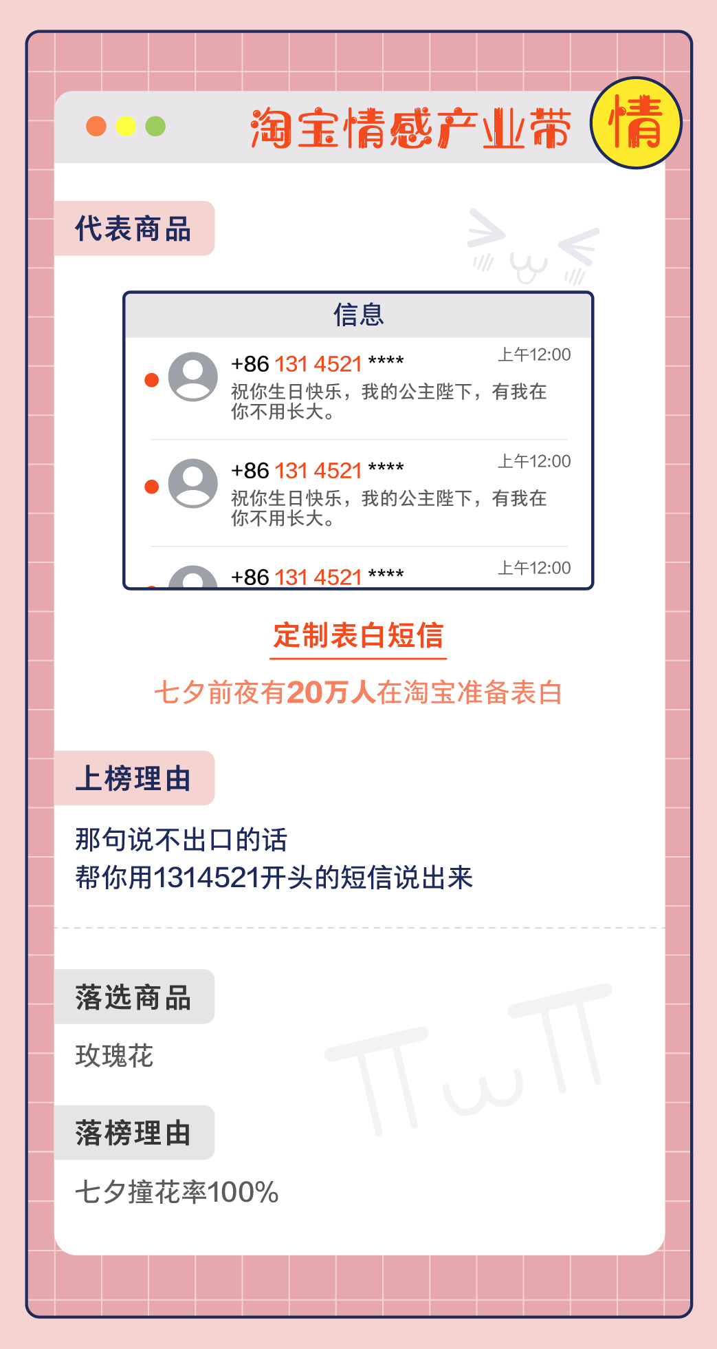 和雷宾类似,淘宝上还有一系列帮人定制表白短信的,给说不出口的爱情一个机会,数据显示,七夕前夜更是有20万人在淘宝上搜索表白方式。淘宝教育上,用软件建模做“玫瑰花”的七夕礼物被直男学习了2437次,试图别出心裁地送一朵3D建模花给自己的女神。