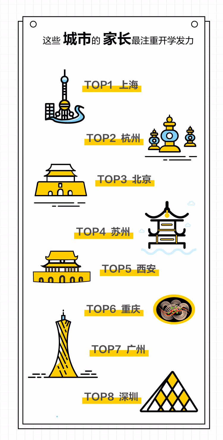 此外,淘宝教育数据显示,上海、杭州、北京、苏州的家长最在乎孩子的开学状态,以西安和重庆为代表的中西部城市家长也对孩子的开学状态分外关心。