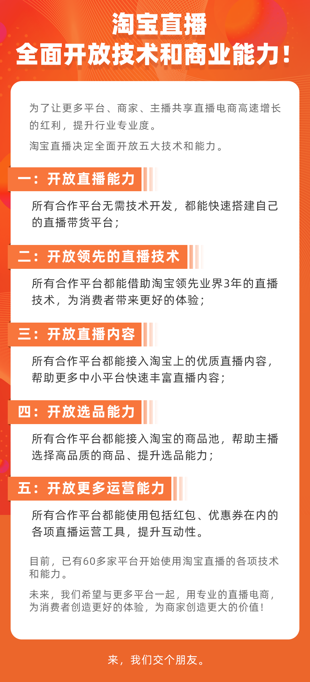 目前,已有60多家平台已经开始使用淘宝直播的各项技术和能力。