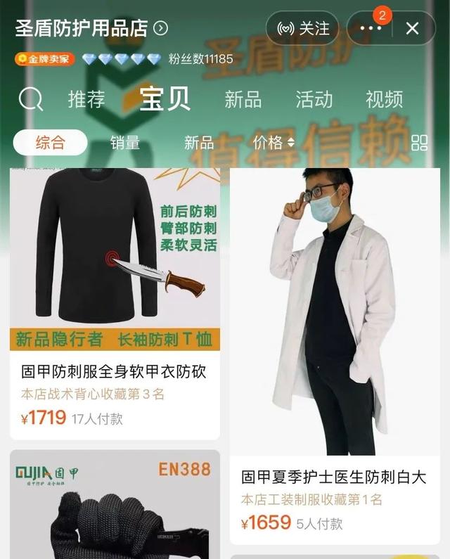 淘宝上有一家店叫“圣盾防护用品店”,店里有款产品叫防刺白大褂,上面的这句话就出现在这款产品的说明中。