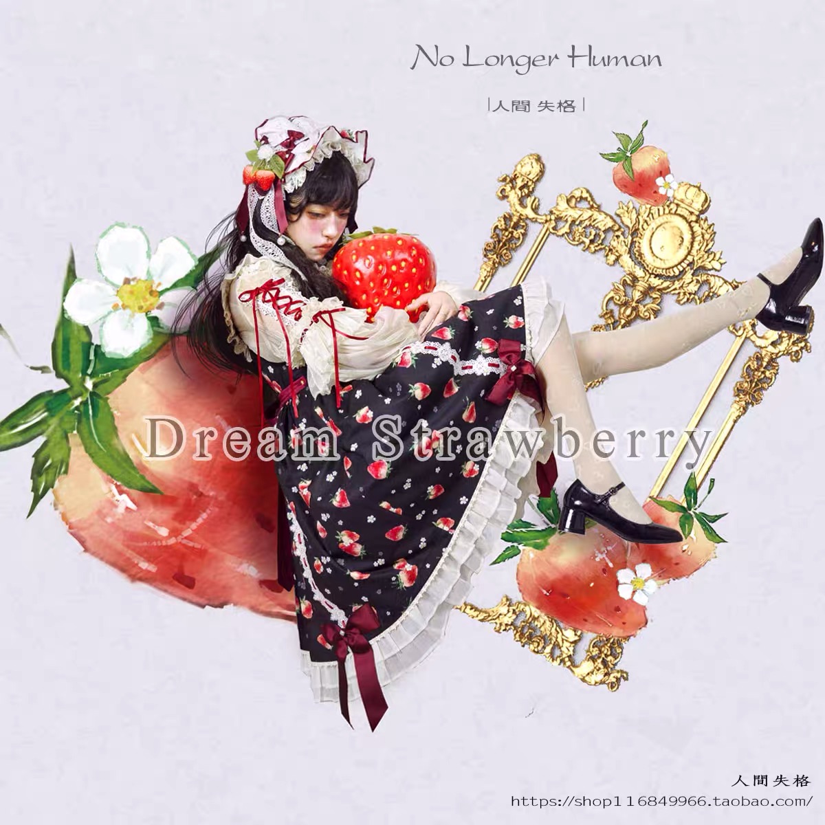 另一款梦中草莓系列作品是人间失格店铺里别具特色的服装,设计灵感来源于清椿做的一个梦:可爱少女、散落草莓、花朵礼裙……莎士比亚的戏剧台词在他耳边不断回响,《爱丽丝梦游仙境》的画面在他脑中闪烁。