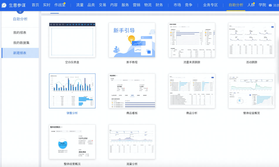 同时针对初次接触报表搭建的店铺运营新手,“自助分析”还提供多个报表模板,可供选择使用。