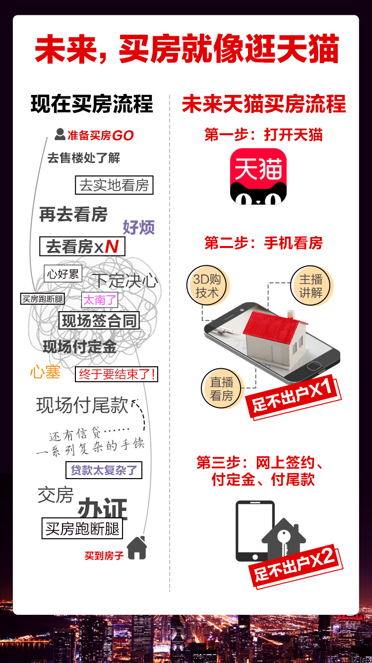 加上后续房产交易链路的逐步打通,房企的天猫旗舰店将成为线上的“智能售楼处”。未来,购房者只要打开淘宝APP,就能足不出户地看房、挑房,买房将会像逛天猫一样省心省力省钱。
